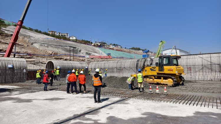 在施工现场,8台自卸车连续运转,两台270型拌合系统全速生产,单日混凝土供应量突破3000立方米。通过推土机、切缝机、挖掘机、振动碾的高效协同作业,首仓6800立方米混凝土一次性浇筑完成,标志着大坝主体施工进入快车道。