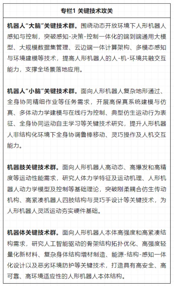 用好现有机器人技术基础,系统部署“机器肢”关键技术群,创新人体运动力学基础理论,打造仿人机械臂、灵巧手和腿足,突破轻量化与刚柔耦合设计、全身协调运动控制、手臂动态抓取灵巧作业等技术。攻关“机器体”关键技术群,突破轻量化骨骼、高强度本体结构、高精度传感等技术,研发高集成、长续航的人形机器人动力单元与能源管理技术。